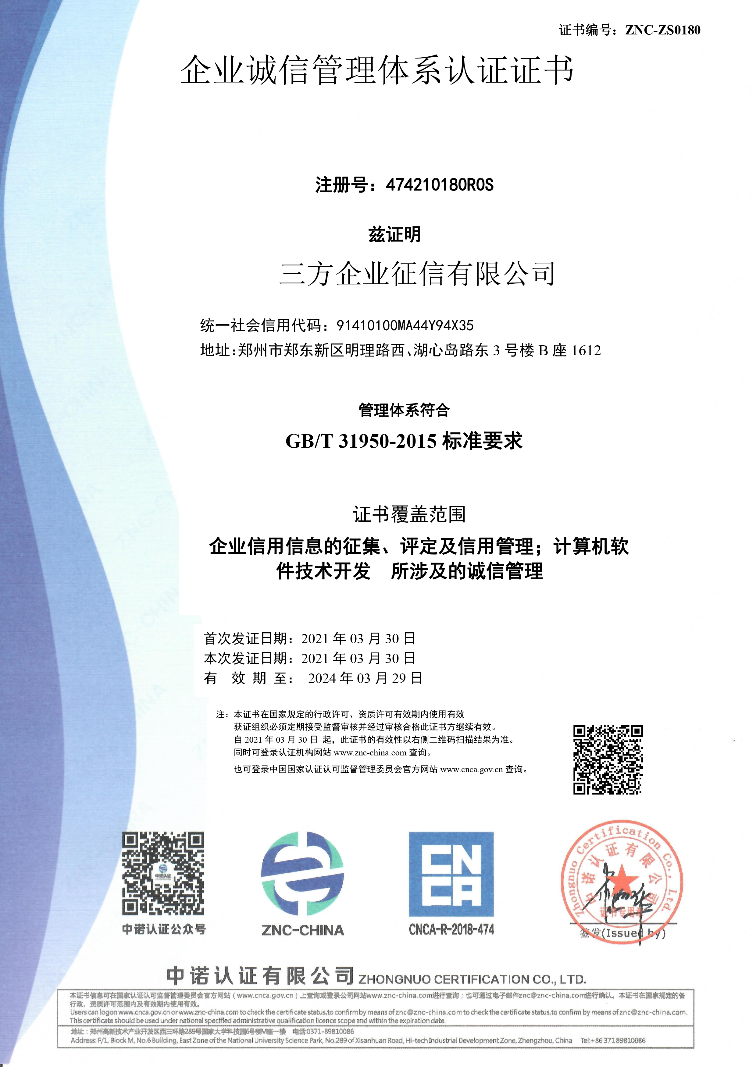 三方企业征信有限公司(以下简称“三方征信”),总部位于河南省郑州市。三方征信经过多年积累,不断扩展服务应用领域,已发展成为以信用体系建设为基础,营商环境优化为核心,平台建设为方向第三方服务机构,创新提出“咨询+平台+数据+运营”四位一体的服务模式,以“大数据+应用”为核心,为各地政府提供社会信用体系建设咨询、营商环境优化、创新应用平台研发等服务。